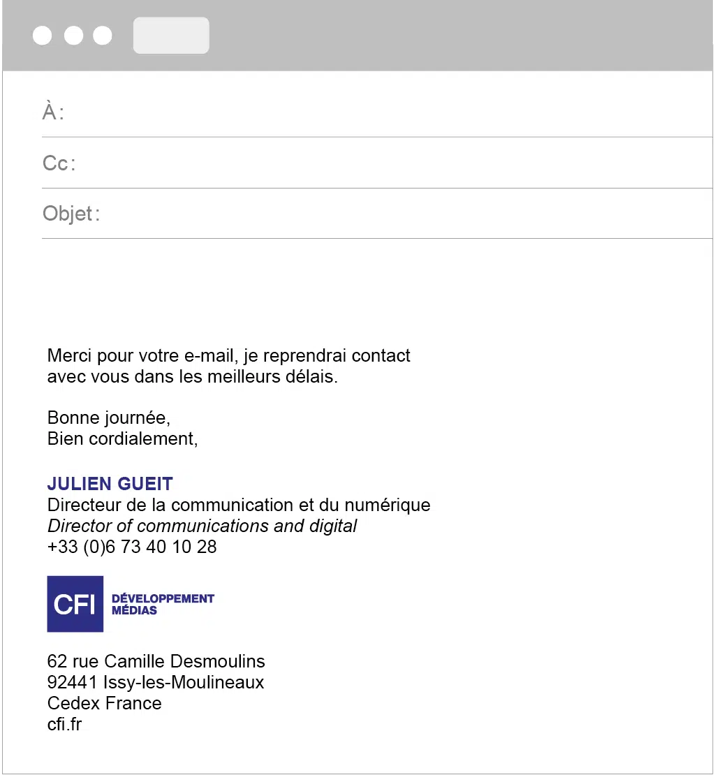 Dépendant de l’application et du terminal sur lequel vous rédigerez vos e-mails, la procédure d’intégration de la signature peut différer ; les instruction du développeur du logiciel utilisé peuvent vous aider à réaliser la mise en forme décrite ci-dessous.